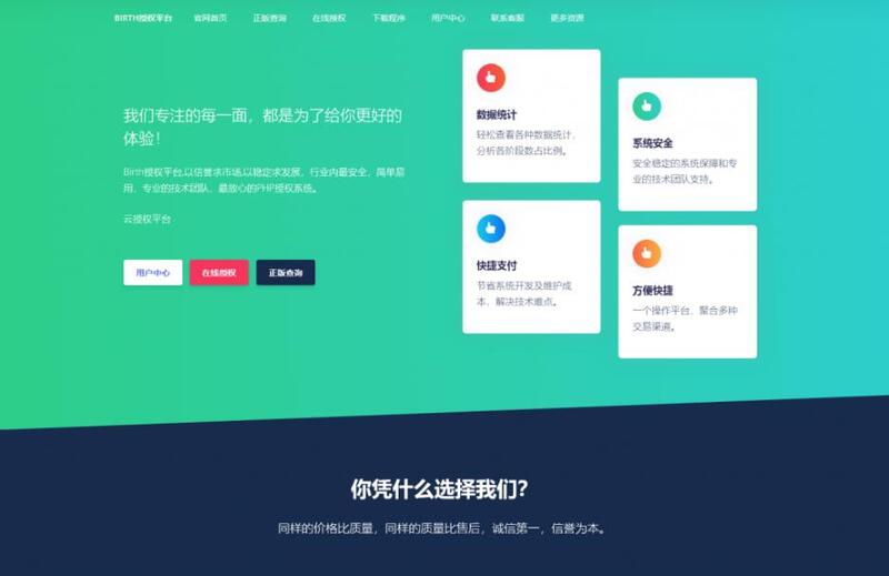 栀子花授权系统(Birth授权系统重铸版),本系统支持泛域名授权,单域名授权,多程序授权,在线更新,盗版入库,API对接,检测授权,站点记录,卡密系统,代理系统等多种主流/小众功能,以信誉求市场,以稳定求发展,行业内最安全,简单易用,专业的技术团队,最放心的PHP授权系统。